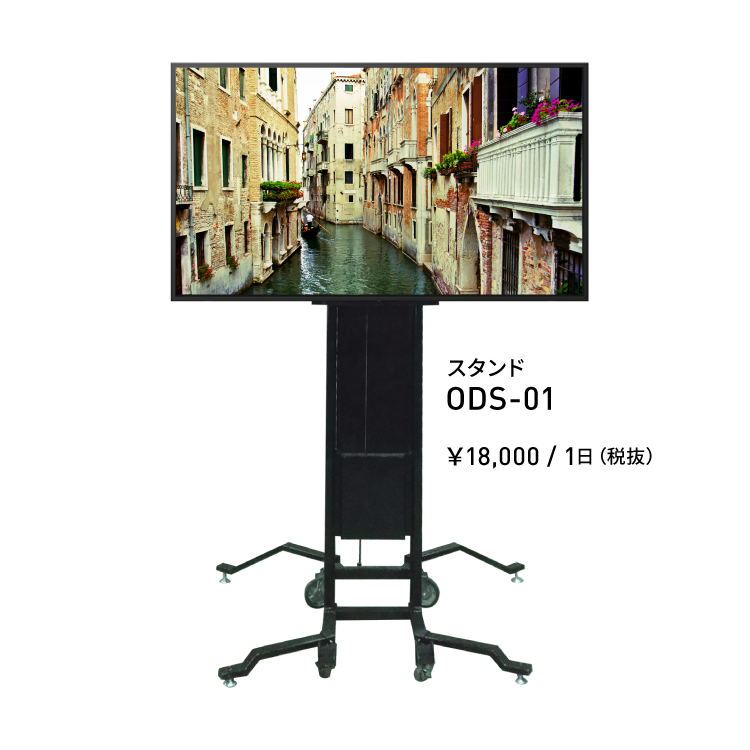 100インチの液晶ディスプレイを、スタンドだけで高い位置に設置できる「ODS-01」。背面のハンドル操作で簡単に高さを微調整できるため、施工時間の大幅短縮が可能。コスト削減にも繋がります。